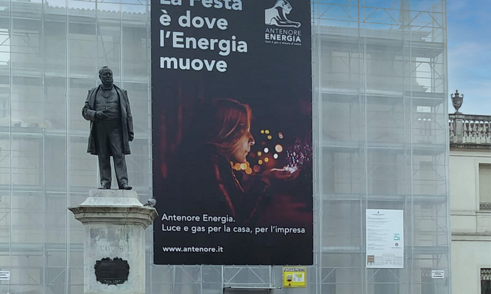 Marcolongo Pubblicità inizia il 2022 valorizzando l’immagine dei propri clienti nel cuore della città di Padova a P.zza Cavour. Questo telo di grande formato rappresenta la la massima espressione della pubblicità OOH. La straordinaria visibilità e l’impatto che le ampie dimensioni offrono danno prestigio alla campagna, all’immagine dell’azienda e la portano nel cuore pulsante delle città.